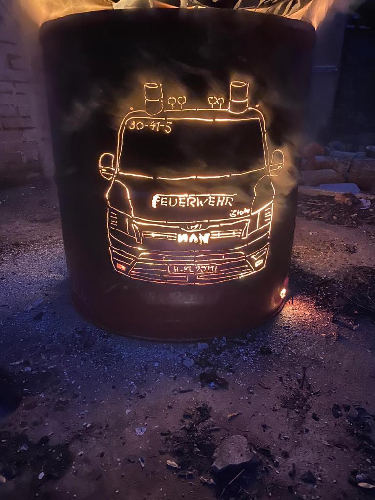 Der stellvertretende Stadtbrandmeister Florian Leisenberg hatte noch eine Überraschung für uns. Die Stadtfeuerwehr überraschte die Feuerwehr mit einer wunderschönen Feuertonne, in der Das Oldhorster Wappen, das Feuerwehrhaus, sowie unser neues KLF darin kunstvoll verewigt ist. Wir danken und freuen uns auf die kameradschaftlichen Abende, in die diese wunderschöne Tonne zum Einsatz kommt.