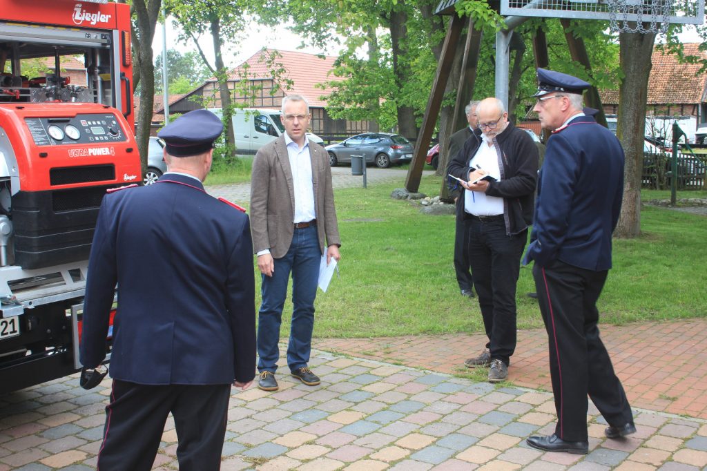 Ortsbrandmeister Hartmut Lübbe und Stellvertreter Andreas Tietgen erklärten Bürgermeister Düker und der anwesenden Presse die Vorzüge und Einzelheiten unseres neuen Kleinlöschfahrzeugs. begleitet von einer gut gelaunten Festversammlung, leider coronabedingt im viel kleineren Kreise, als es die Fahrzeugpräsentation verdient hätte.