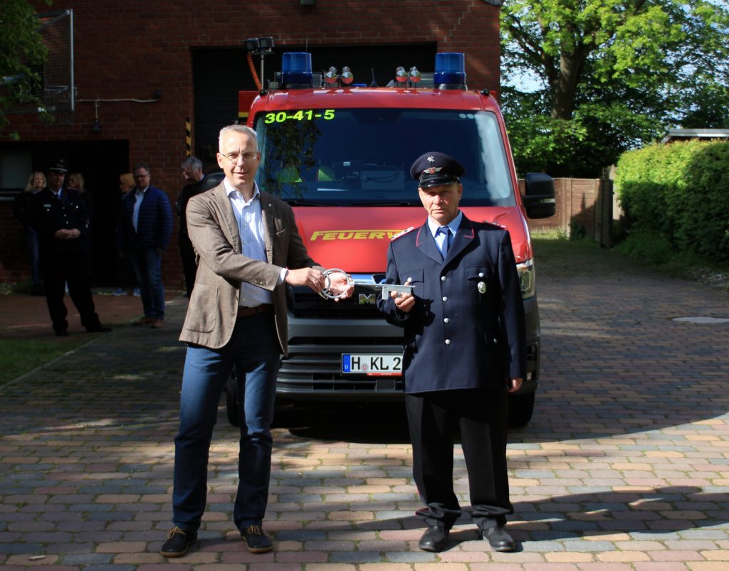 Symbolisch übergibt Axel Düker den Schlüssel an die Stadtfeuerwehr und die an Ortstbrandmeister Hartmut Lübbe.